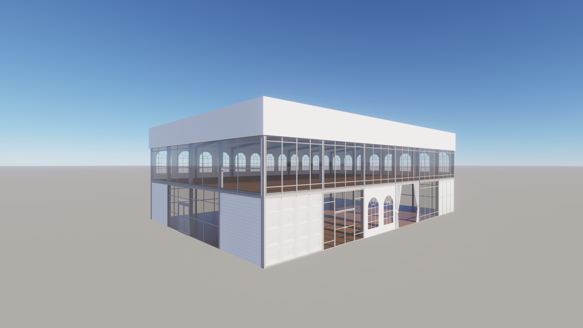 平顶双层楼是在充气平顶的基础上设计改进的。因此,它也标配有双层隔热充气顶以及大幅的广告围板,这也是平顶双层楼结构最不同于其他双层楼结构的特点。平顶双层楼的边高高于8m,可有8m、10m可选。中间的隔层可以灵活变化成T字型,U字型或一半等等。这样可以灵活满足您对空间的安排与设计,无论是作为VIP区域、会议区、媒体区,看台等等,双层楼可以对内部空间进行更有层次的规划与分隔。作为可移动模块化结构,平顶双层楼仍可与其他NPS配件通用,包括玻璃墙、硬体墙、隔热墙体等等。同时也可装配阳台、露台、飘檐、围栏等配套设施。