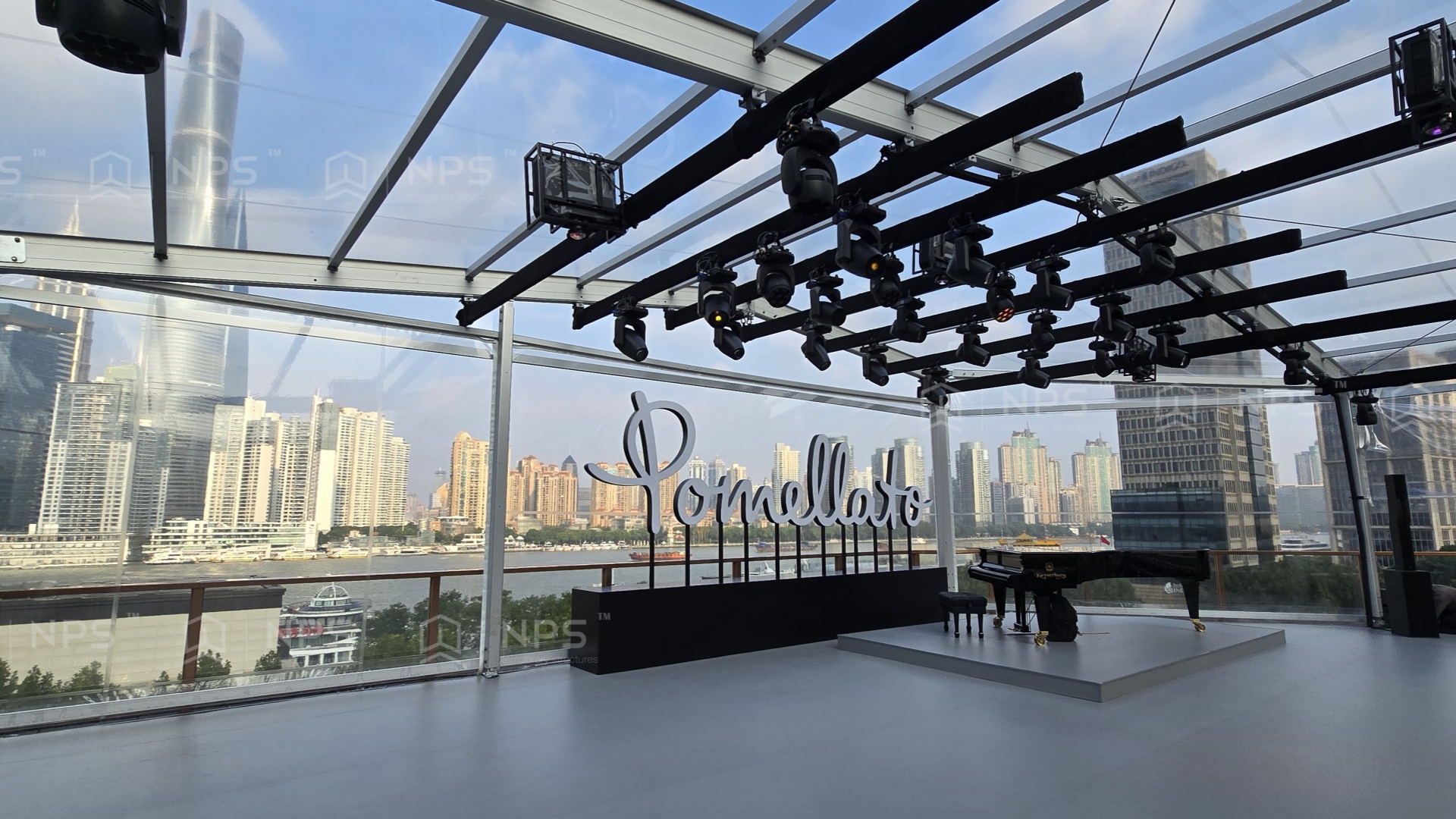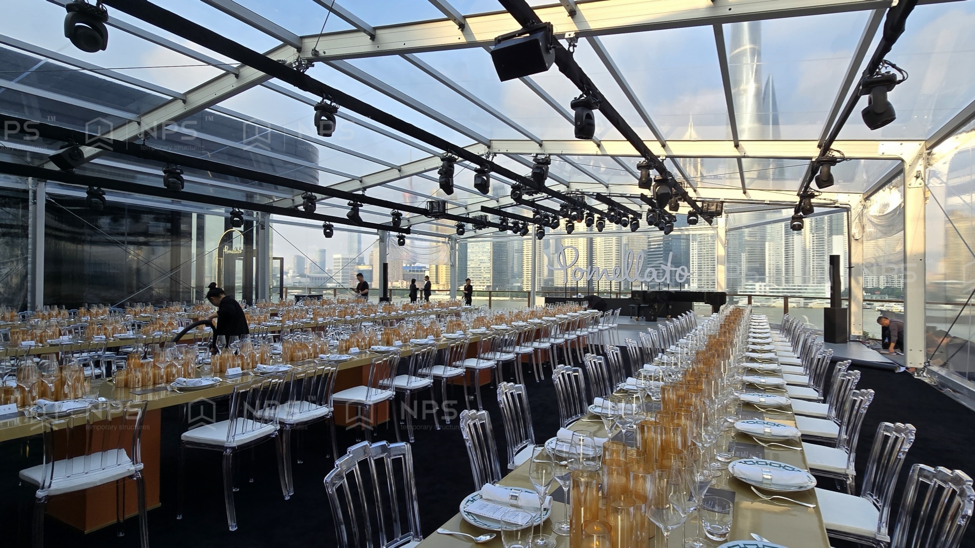 NPS奈柏建筑的产品采用符合欧洲标准的高强度铝合金框架,兼具轻质坚韧与抗风耐候特性,更根据晚宴场地在上海外滩复兴艺术中心楼顶的特殊条件,进行优化结构设计,确保极端天气下的安全稳定;顶篷则选用定制级PVC膜材,不仅具备阻燃、抗UV等优异性能,结合NPS奈柏高品质的生产工艺,保证了其平整度及透光度,从而使得整个宴会厅精致且博人眼球。