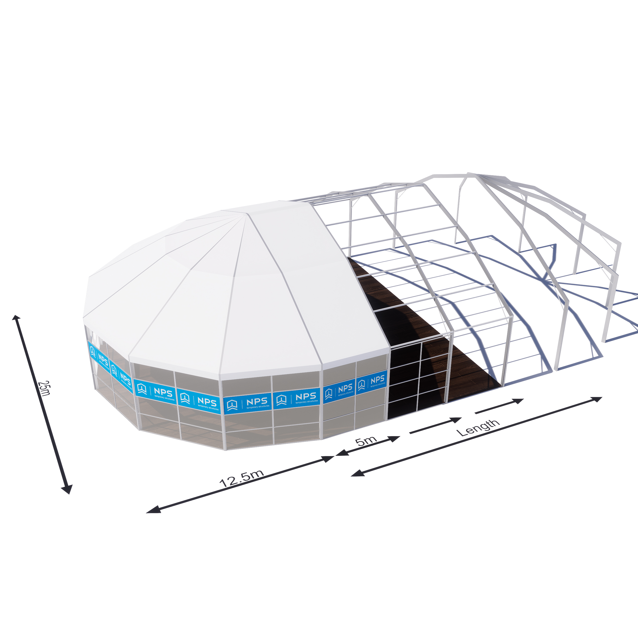 NPS奈柏建筑的组合型篷房是一个庞大的家族,它可以由我们各类不同的结构相组合。NPS组合型篷房主要分为三大类,多拱形组合篷房是多拱形篷房与多拱形多边形组合而成。因此它的屋顶仍然保留着多拱形的节点与角度。这无疑为传统的多拱形篷房增加了许多特点和趣味。多拱形组合篷中间段为多拱形篷并且可无限加长,两头为连接多边形单元的半圆形拱形厅。多拱形组合篷拥有更高的顶高,因此非常适用于各类的体育活动或是赛事。