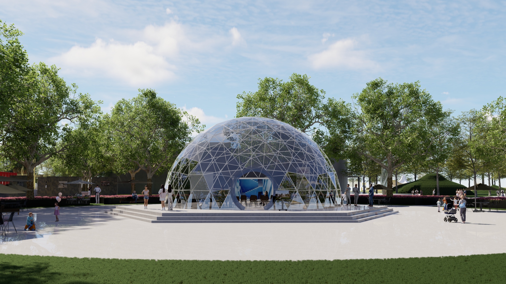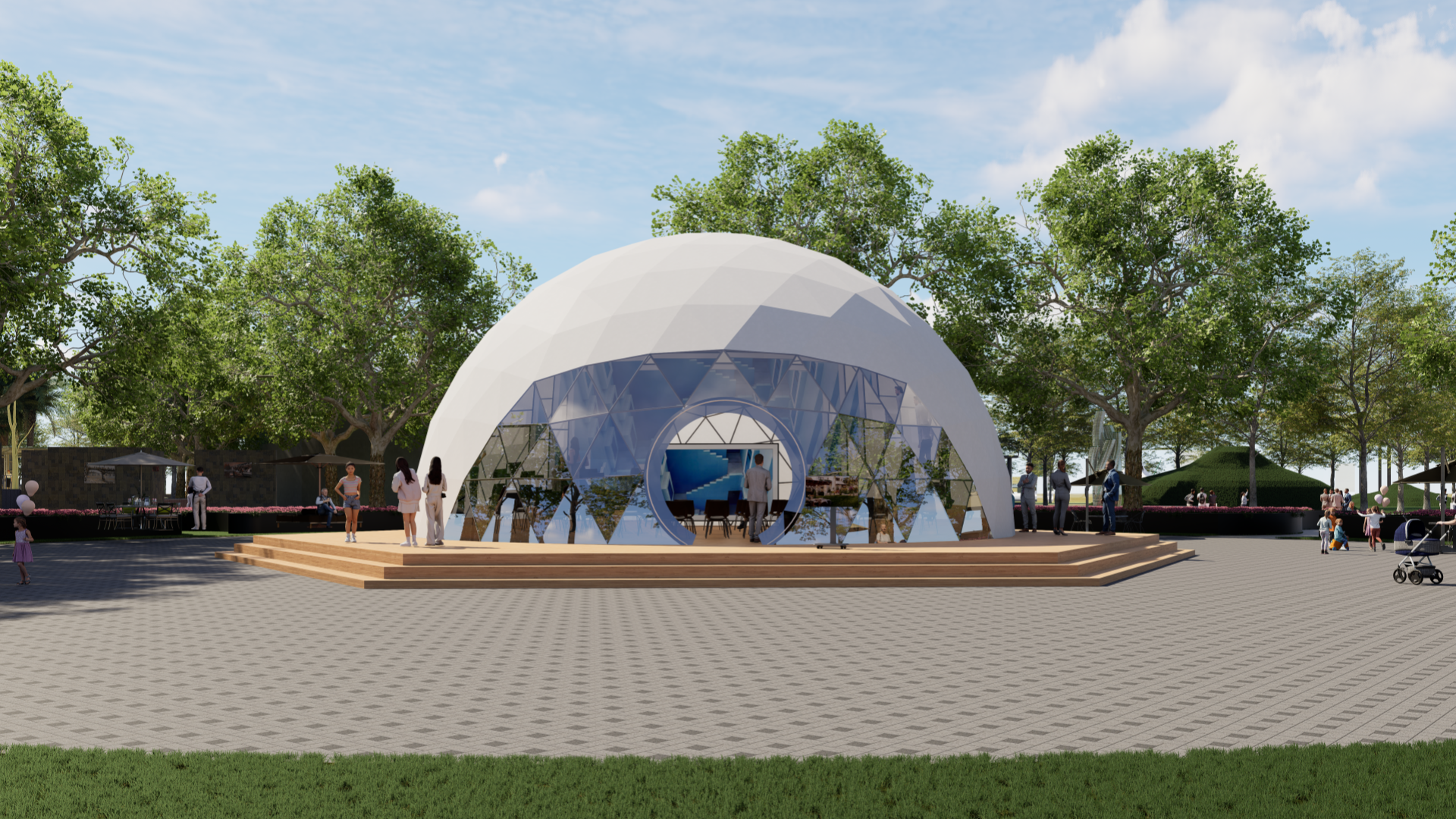 Our Geodesic Dome is in the shape of three-fifth sphere that makes it look like a bubble on the ground. The unique and enjoyable look makes the Geodesic Dome favored by all kinds of events, exhibitions, trade fairs, conventions etc. It can be as small as 3m in diameter; it can also be built in to a huge one with 60m in diameter. So it’s always used as VIP halls, media centers, convention rooms etc. Inner projection curtain is available to make it a huge spherical cinema.