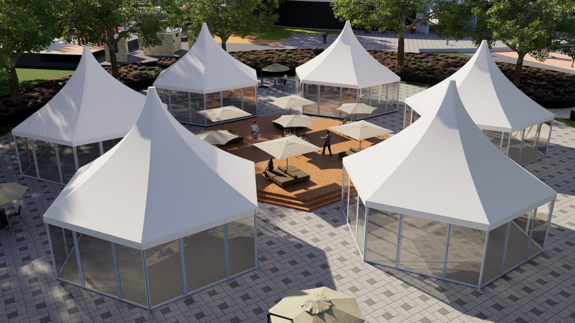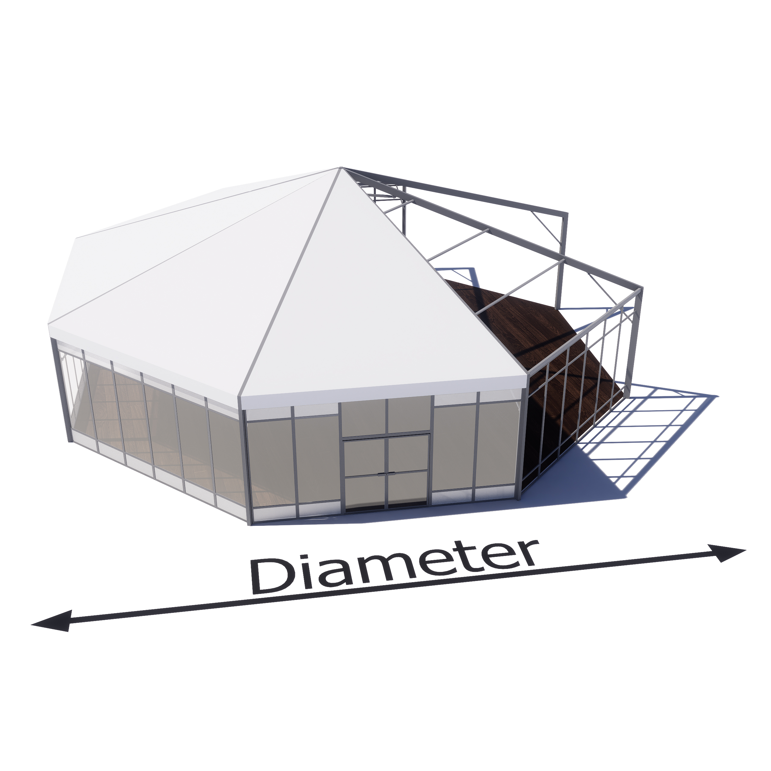 The Hexagonal High Peak of NPS Modular Structures (NPStructures) is a combination of pagoda and polygonal tent. It has a polygonal body and a pagoda roof. The unique design and the stylish look make it well accepted by catering, weddings, parties, trade fairs and other events that held indoors and outdoors. Comparing with the multisided tents, the Hexagonal High Peak is of smaller size so it’s always used in combination. Being connected with each other, the NPS Hexagonal High Peak combination looks like a beehive that offers a larger and enjoyable inner space. It can also be connected with other NPS structures to meet your specified space requirements. Full range of accessories is available.