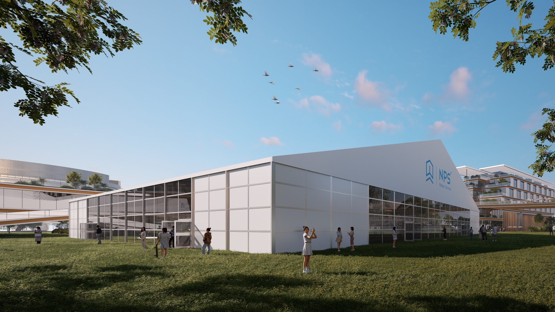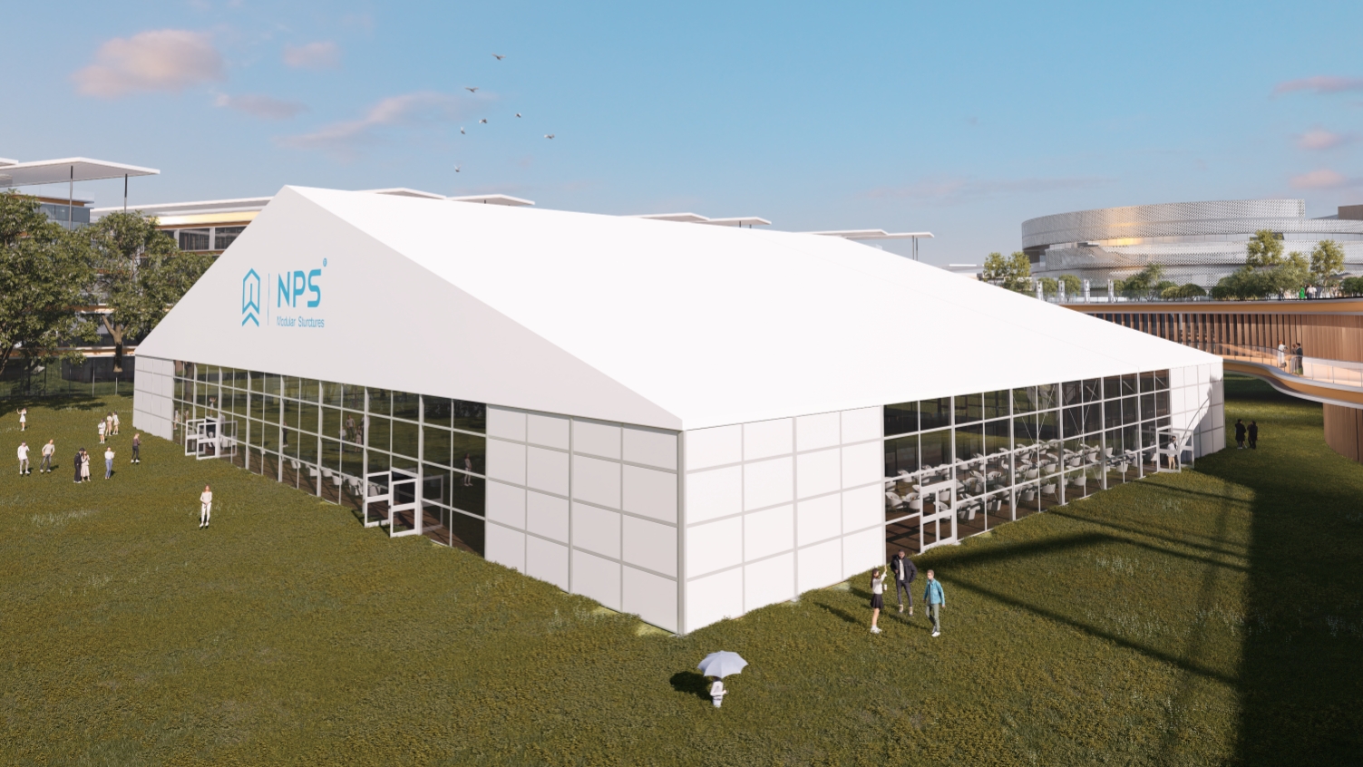 The NPS HTM Series adopts the design of free span – no upright columns inside. That means the space can be divided freely into several functional areas such as reception area, dining area, conference room, negotiation room etc. as long as you like. Guaranteed by NPStructures design and quality, the structure can be equipped with all the NPS accessories to get different results.